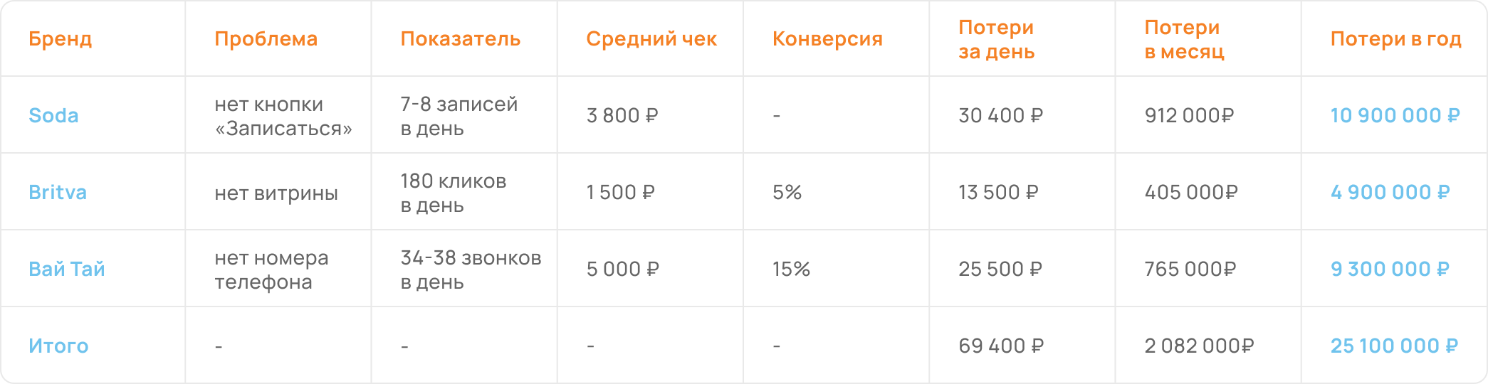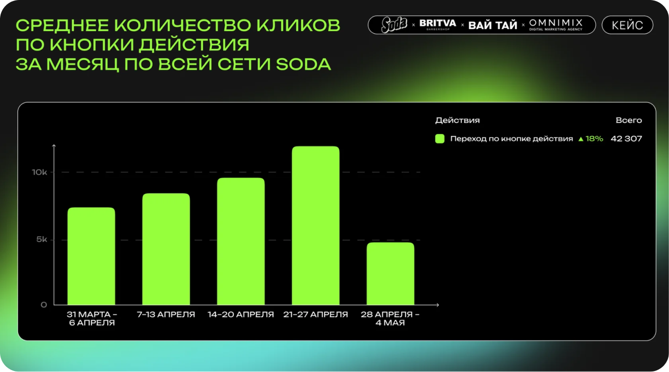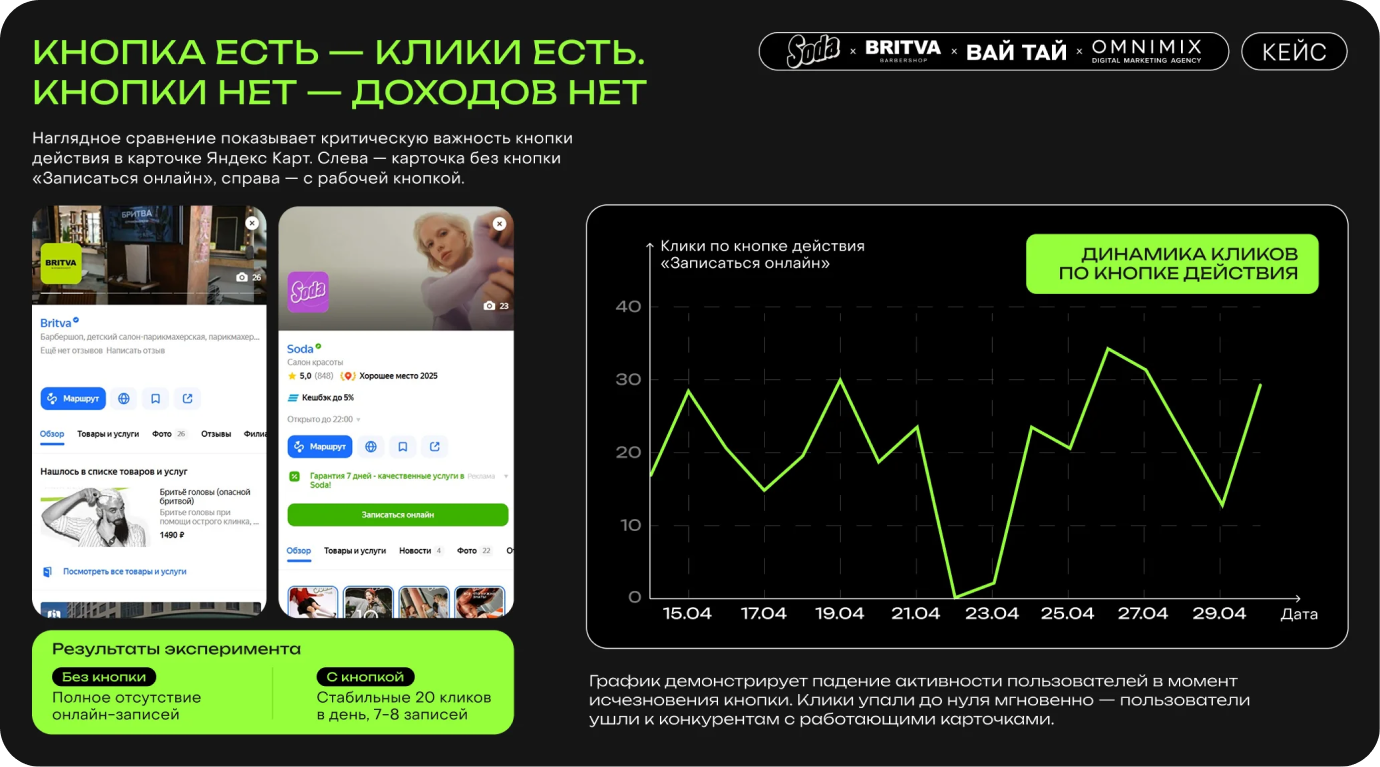 22 апреля команда OMNIMIX обнаружила технический сбой в карточке одного из филиалов сети салонов красоты Soda — исчезла кнопка «Записаться онлайн». Это тот самый элемент, который ежедневно генерировал 20 кликов и приводил к 7−8 записям с средним чеком 3 800 ₽.
