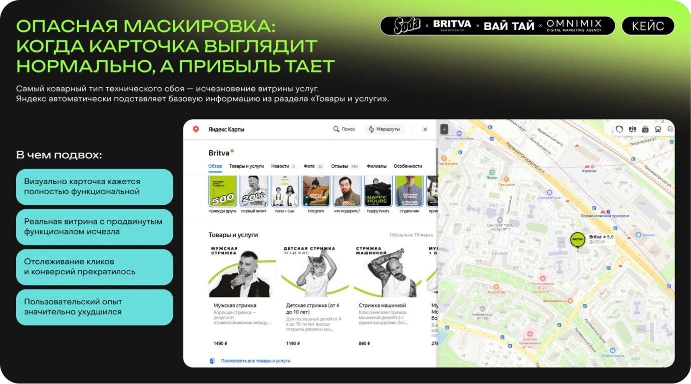 15 мая удар пришёлся по сети барбершопов Britva. Из карточки одного филиала исчезла витрина услуг — элемент, который стабильно приносил 180 кликов в день от пользователей, заинтересованных в конкретных услугах.