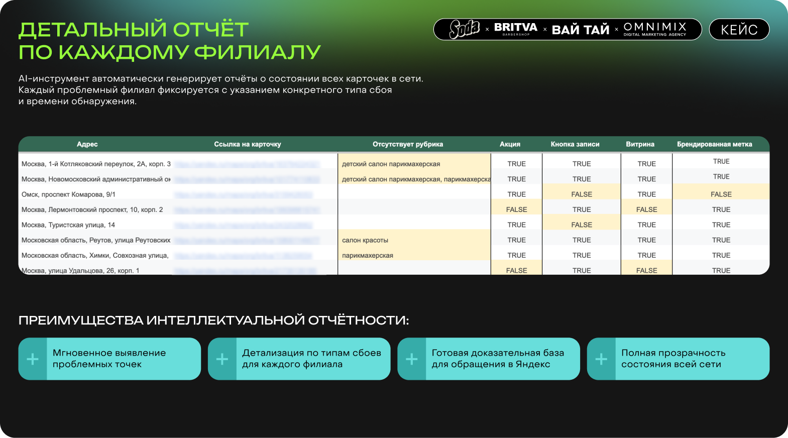 Также AI-инструмент масштабируется на любую сеть — от 10 до 500 филиалов. Уже сейчас он применяется в проектах с федеральным покрытием, включая бизнесы с франшизной моделью, где контроль каждой точки особенно критичен.