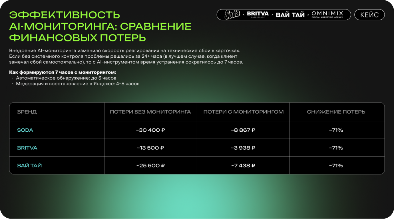 Внедрение усовершенствованного AI-инструмента кардинально изменило подход к контролю карточек на Яндекс Картах. Если раньше ошибки могли оставаться незамеченными по 2−3 дня, все это время бизнес терял клиентов и деньги, то теперь система выявляет проблему в течение нескольких минут, а команда сразу приступает к устранению. Скорость восстановления. После передачи информации в Яндекс необходимые элементы карточек возвращаются в течение 6−8 часов. Ранее на это уходили сутки и больше. Быстрая реакция. Время от возникновения ошибки до начала её устранения сократилось с двух-трёх дней до 2−3 часов. Это обеспечивается автоматическим уведомлением. Снижение потерь. Благодаря оперативному реагированию финансовые потери клиентов снизились более чем на 70%. Проблемы не затягиваются, карточки работают стабильно, а бизнес не теряет поток клиентов.
